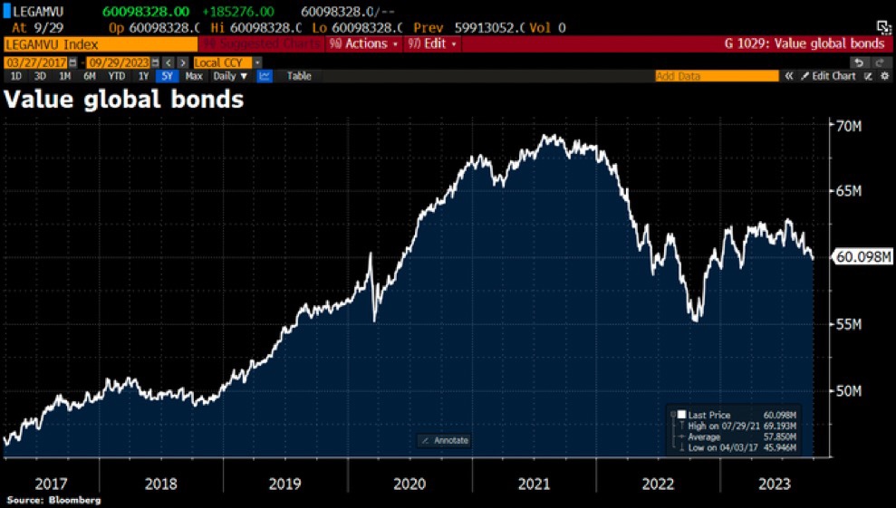 🚨 🚨 The value of global bonds dropped another $428bn this week as the interest rate world keeps repricing for a higher for longer. In past quarter, bonds lost ~$1.8tn in value