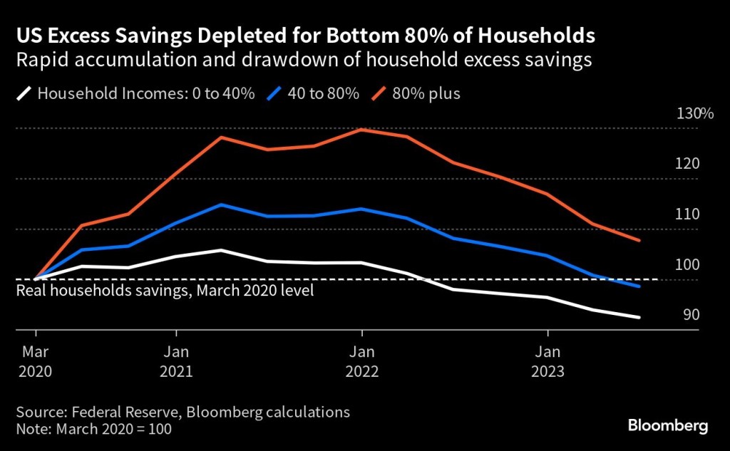 🇺🇸 🇺🇸 Americans outside the wealthiest 20% have run out of extra savings and now have less cash on hand than they did when the pandemic began. The figures point to dwindling firepower available for US consumers, whose resilience has kept the economy growing at a rapid clip this year and staved off the recession that many expected