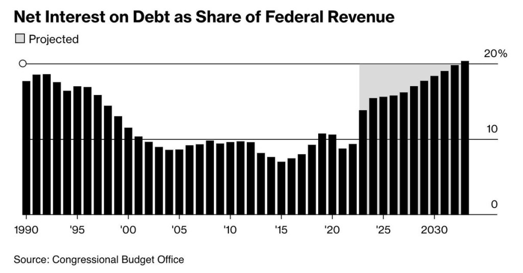 🇺🇸 🇺🇸 For nearly 20 years, it was effectively free for the US to issue debt as debt service costs were ~1.5%. Now, debt service costs have doubled to 3% and will rise toward 5% as rates skyrocket
