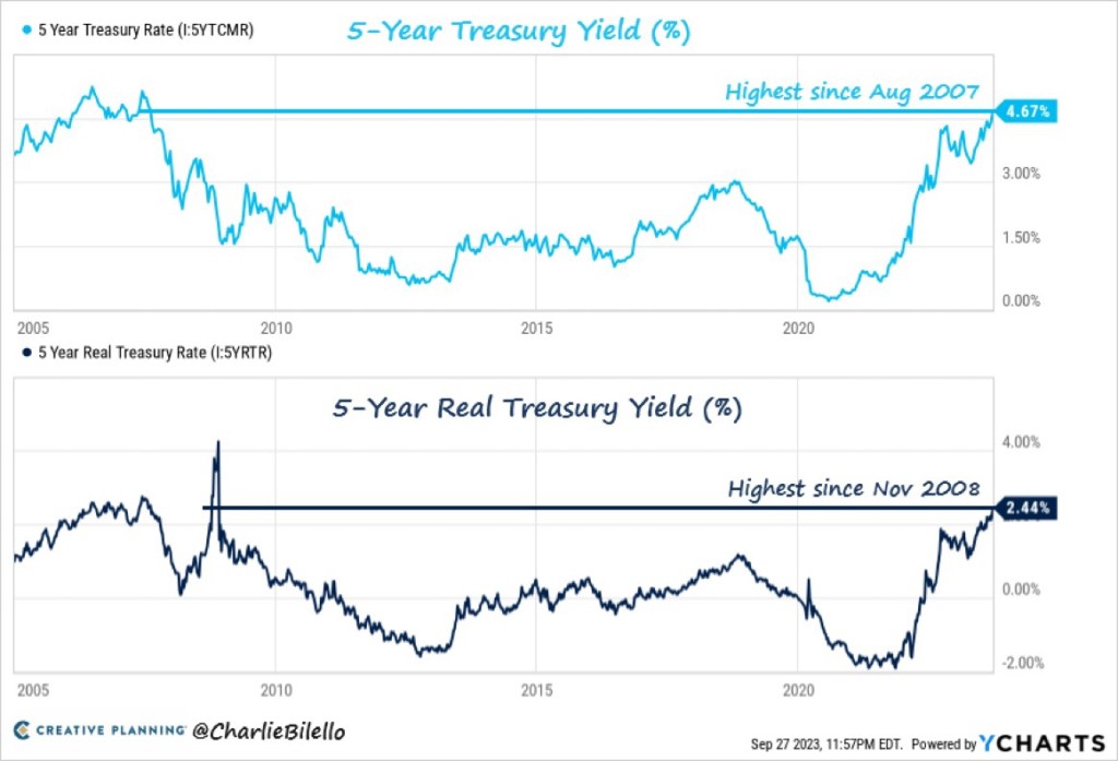🚨 🚨 5-Year Treasury Yield moved up to 4.67% today, highest since Aug 2007. Real 5-Year Yield (adjusted for expected inflation) of 2.44% is the highest since Nov 2008