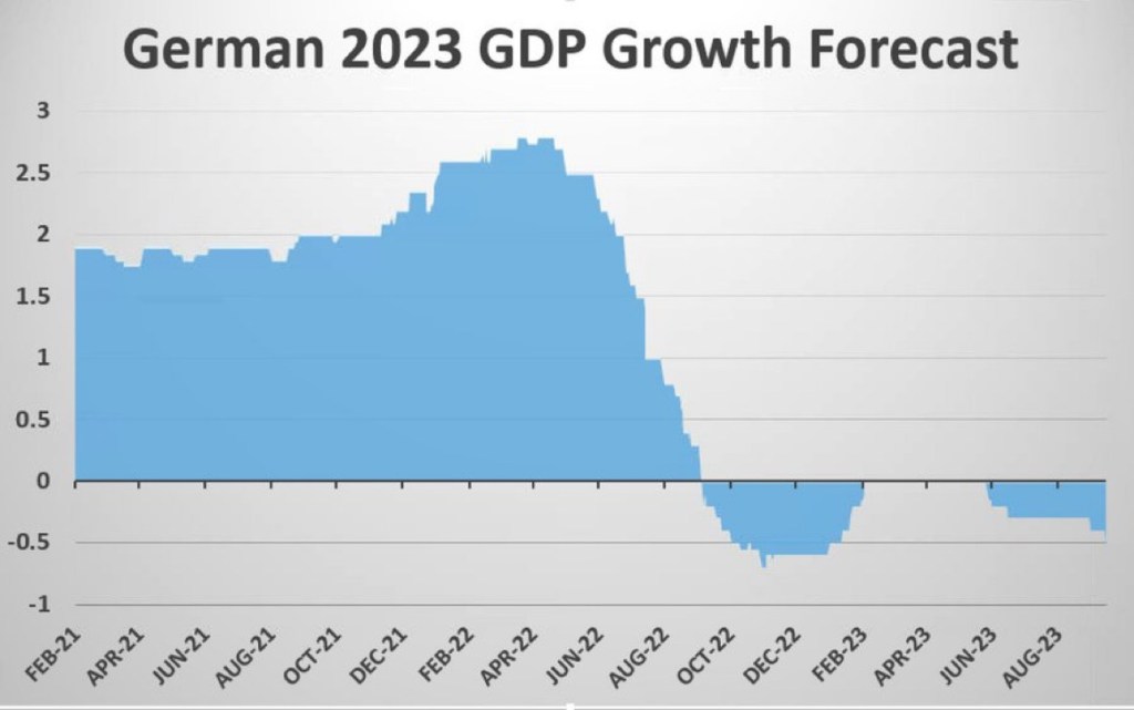 🇩🇪 🇩🇪 Germany: The growth outlook is being cut further and further. Top economic research institutes now expect Germany’s GDP to contract by 0.6% in 2023, compared w/earlier projection of a 0.3% growth in April