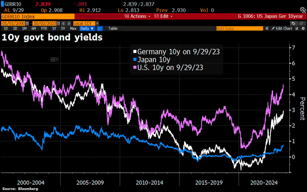 🚨 🚨 From US to Germany to Japan, once unthinkable bond yields now new normal. Selloff has been so extreme it’s forced bullish investors to capitulate & Wall St banks to tear up their forecasts. Yields on 10y German debt close to 3%, a level not reached since 2011. Their US equivalent back in line w/avg from before GFC, within striking distance of 5%