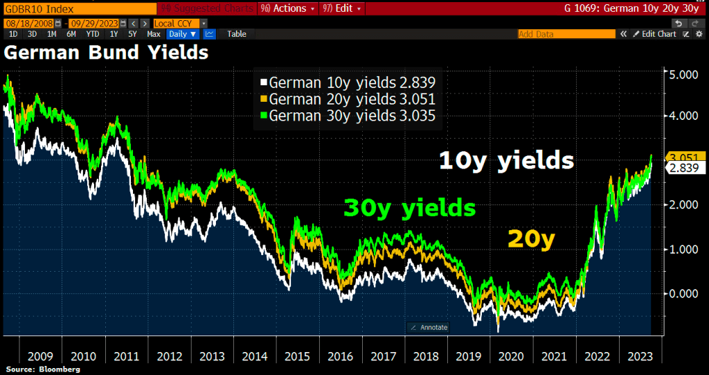 🇩🇪 🇩🇪 German 20y and 30y yields have risen >3%, highest since 2011. The rise in interest rates on long-term bonds has a much higher leverage on economic development than the rise in key ECB rates at the short end