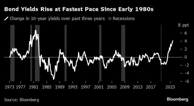 🚨 🚨 Warning To Powell: The last time US government bond yields climbed so far, so fast, the nation plunged into back-to-back recessions. The 10-year Treasury yield — a key baseline for the cost of money across the financial system — has jumped more than four full percentage points over the past three years
