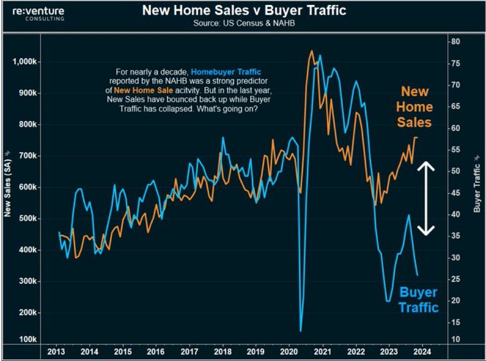 🇺🇸 🇺🇸 Something strange is going on with the Home Builder Sales figures. New Home Sales have “bounced” back up over the last year, surprising many in the Housing Market. Yet – Buyer Traffic at home builder sites has collapsed to the lowest level in decades
