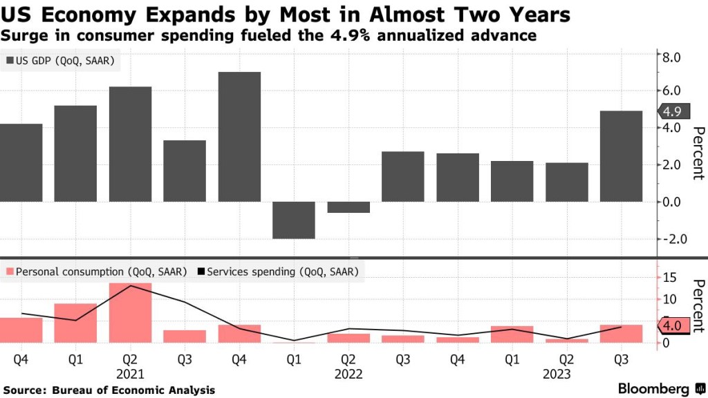 🚨 🚨 Why Stocks Dropped: US Economy Grew at a 4.9% Pace Last Quarter, Fastest Since 2021. Consumer spending jumped at 4% rate, also the most since 2021. Core PCE price index increased a less-than-forecast 2.4%. This strong data increases the probability Federal Reserve officials will raise interest rates again