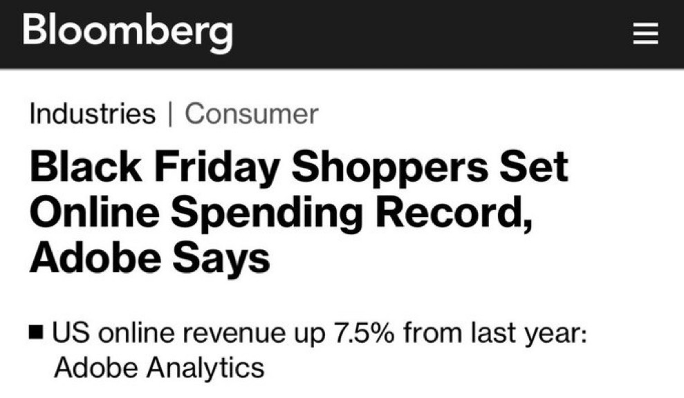 🛍️ 🛍️ Black Friday shopping brought in a record $9.8 billion in online sales in the US, up 7.5% compared last year. On Thanksgiving, the day before Black Friday, total online sales were $5.6 billion in the US