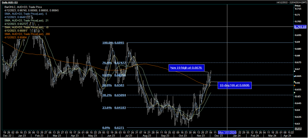 🇦🇺 🇦🇺 AUD/USD – Breaks Resistance As Jump In Gold Price Supports. AUD/USD has broken above resistance at 0.6676 to 0.6690 high. Resistance is at the 76.4 of the July/Oct fall at 0.6747. RBA expected to deliver a hawkish hold at Tuesday’s decision