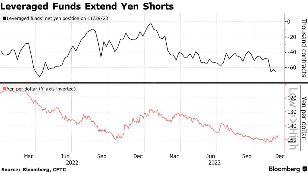 🇯🇵 🇯🇵 JPY Traders Listen Up: Hedge funds boosted bearish yen wagers to the highest level since April 2022 last week as speculation increased that the Bank of Japan is unlikely to turn hawkish. Leveraged funds’ net yen shorts increased by 2,833 to 65,611 contracts as of Nov. 28 according to CFTC data