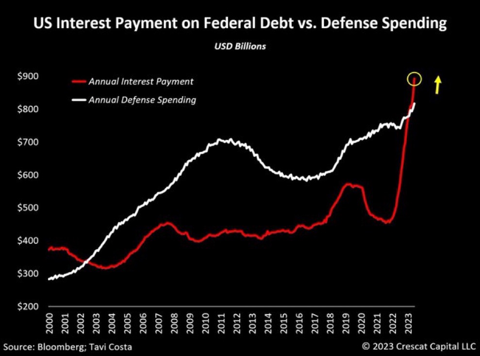 🇺🇸 🇺🇸 Annualized interest expense on US Federal debt is nearing $1.1 TRILLION. To put this in perspective, 2023 defense spending was $821 billion. This means the US is on track to spend 34% MORE on interest expense than defense spending