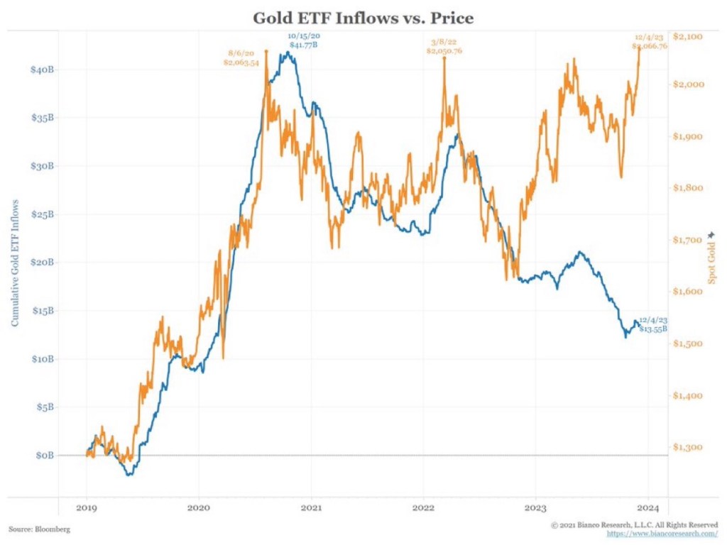 🚨 🚨 #Investors Take Note: Even though gold is going up (orange), money is not flowing into gold ETFs (blue)