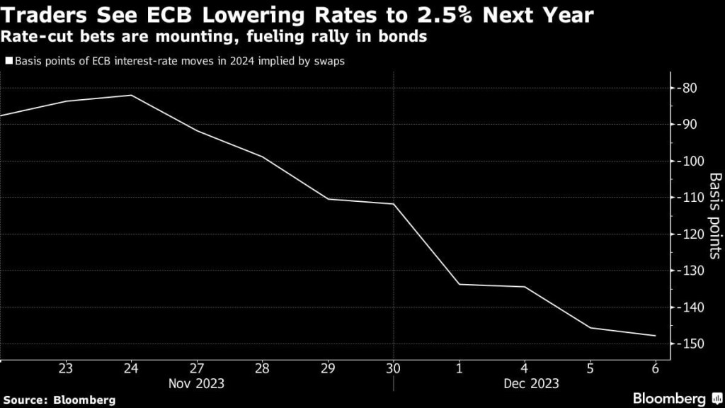 🇪🇺 🇪🇺 Traders now see less than 150 basis points of ECB rate reductions next year, down from 165 basis points priced earlier in the session, according to swaps tied to ECB policy meeting dates. Investors also decreased bets that the first move will come in March, attributing a 70% chance to a quarter-point cut, down from 80%