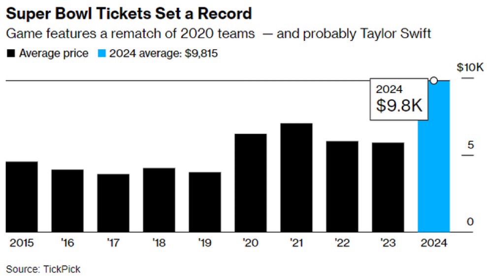 🏈 🏈 Recession? The average price of a Super Bowl ticket this year has moved up to a record $9,815, 70% above last year’s average price and 40% above the previous record set in 2021