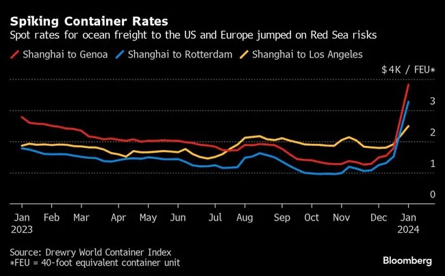 🚢 🚢 Spot Container Shipping Rates Soar 173%: Short-term rates for container shipping between Asia, Europe and the US are climbing on reduced capacity caused by the ongoing threats to cargo vessels in the Red Sea