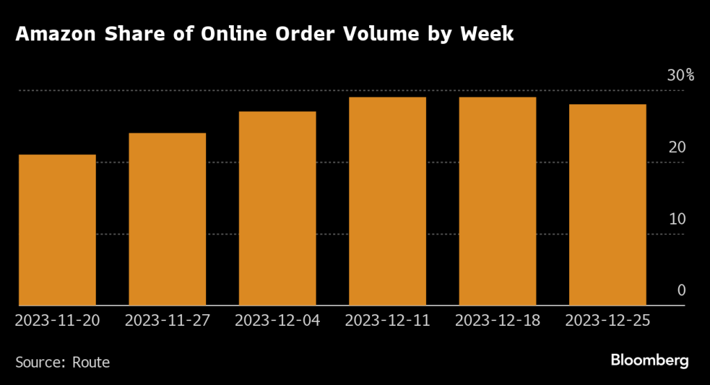 📦 📦 Amazon captured 29% of global order volume in the final two weeks before Christmas, up from 21% the week of Thanksgiving and Black Friday, according to Route, a package-tracking app that captured holiday season data from 55 million orders