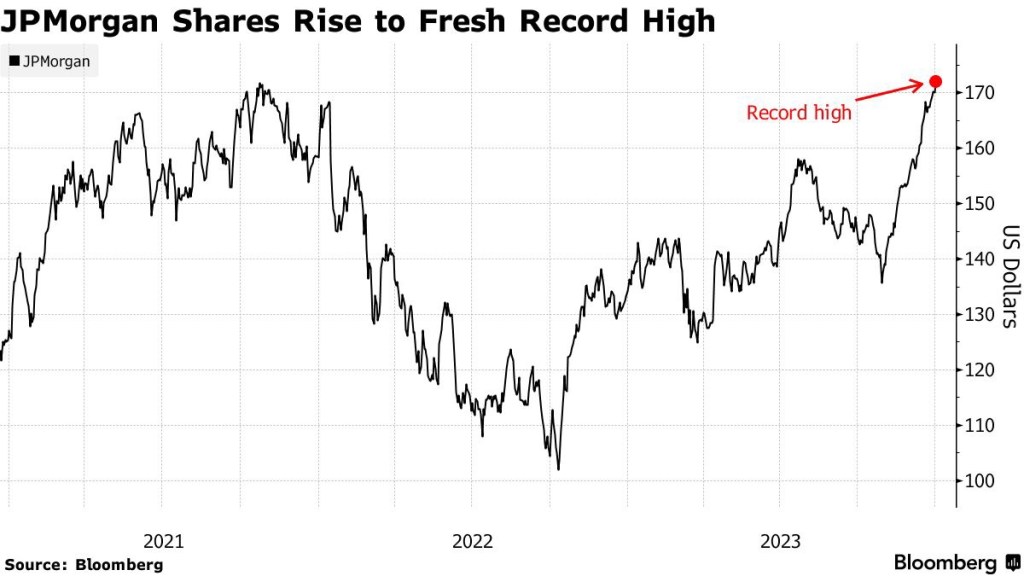 🇺🇸 🇺🇸 BREAKING: Shares of the largest US bank gained 1.2% to $172.08, surpassing the prior high watermark set in October 2021. The New York-based lender has been a top performer in the sector as it posted record results last year, prompting its Chief Executive Officer Jamie Dimon to warn that the bank is “over-earning” in some areas