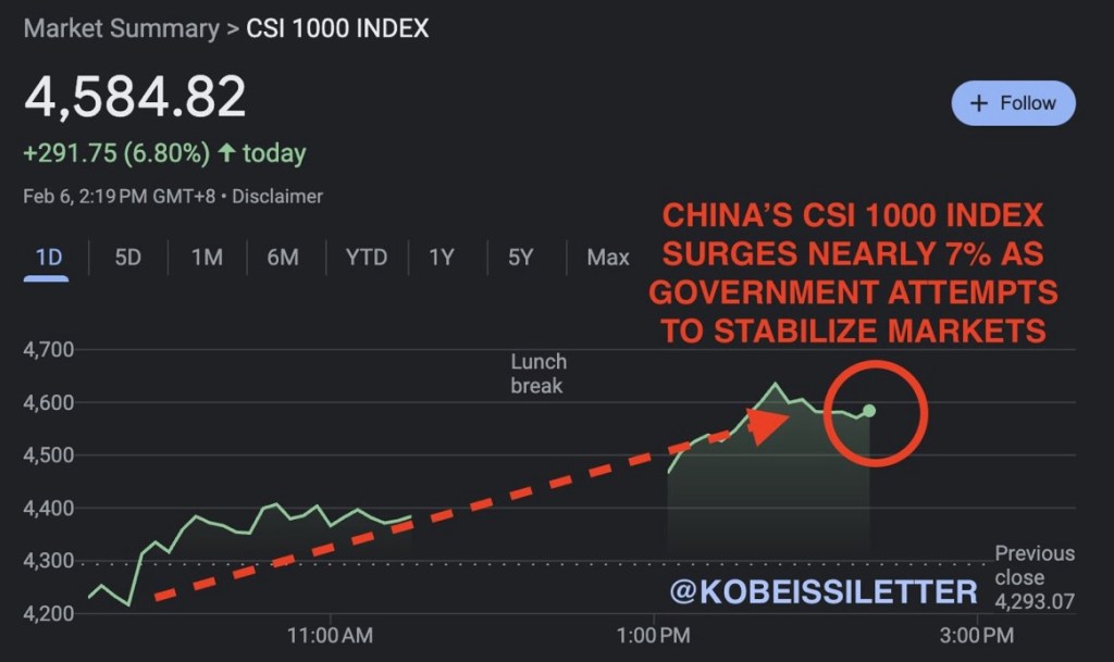 🇨🇳 🇨🇳 BREAKING: China’s CSI 1000 index surges 7% after Chinese President Xi discusses stabilizing markets with regulators. The CSI 1000 index is on track for its biggest single day gain in history