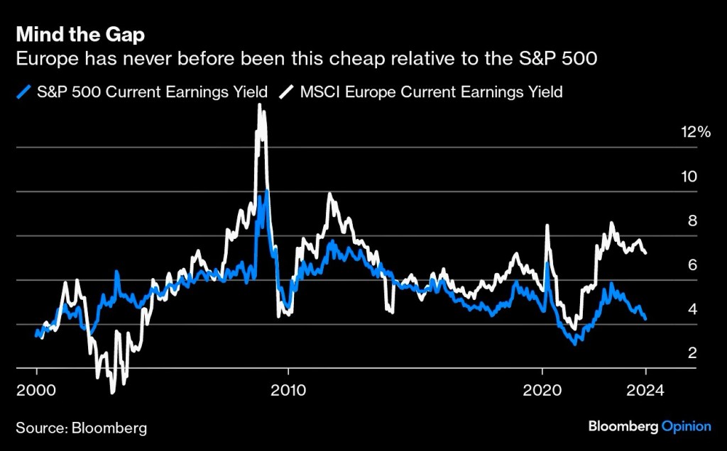 🇺🇸 🇪🇺 The US is currently seeing the widest gap between S&P 500 current earnings yield and MSCI Europe Index ever