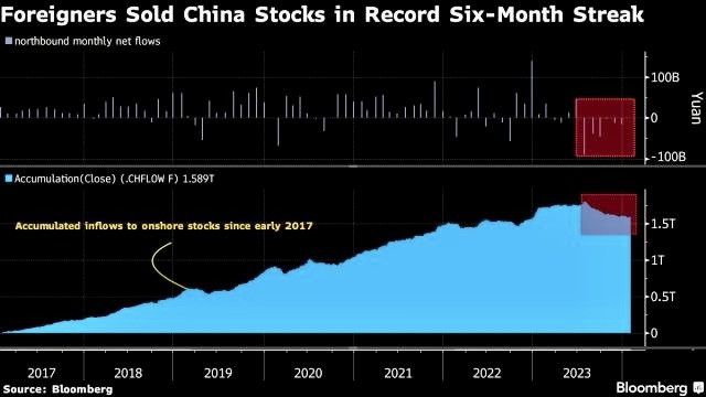 🇨🇳 🇨🇳 Global funds offloaded 14.5 billion yuan ($2 billion) worth of Chinese shares on a net basis in January via trading links with Hong Kong, extending their selling to a record sixth month. That brings the total amount of stocks sold since August to 201 billion yuan