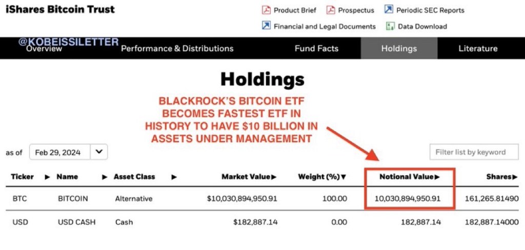 🚨 🚨 BlackRock’s Bitcoin ETF, $IBIT, hits a record $10 billion in assets under management. This is the fastest an ETF has hit $10 billion in assets under management, at 37 trading days