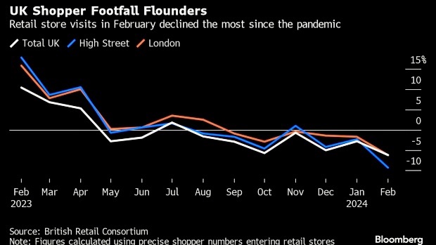 🇬🇧 🇬🇧 UK retail traffic fell the most since the pandemic due to train strikes, squeezed budgets and one of the wettest Februarys on record, fueling concerns about the strength of the economy