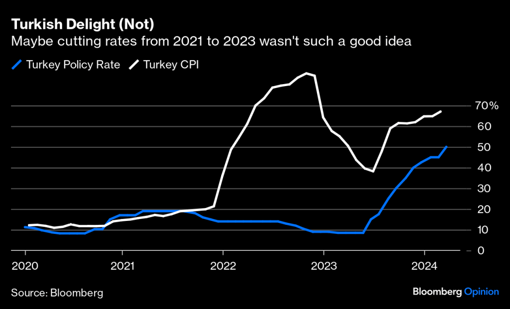 🇹🇷 🇹🇷 Turkey Is Suffering: Recep Tayyip Erdogan, has an intriguing theory that higher interest rates increase inflation, and that the way to bring prices down is to cut rates. He has also amassed enough power over Turkey’s institutions that he was able to force the central bank to put his ideas into effect. A two-year campaign of rate cuts started in 2021