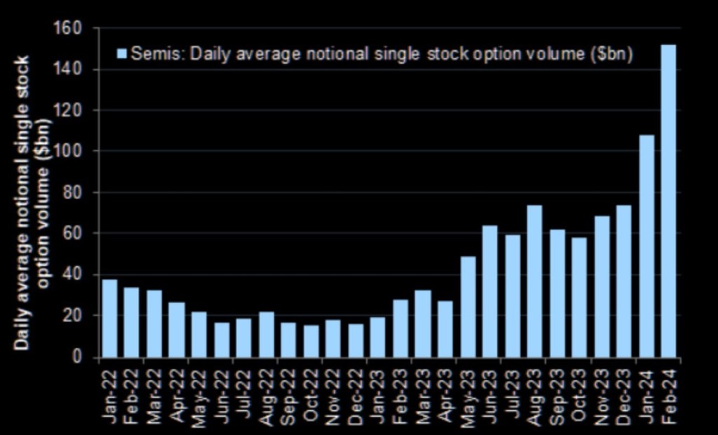 🚨 🚨 Options volume in semiconductor stocks, and especially $NVDA, has surged to new all-time highs, per Goldman