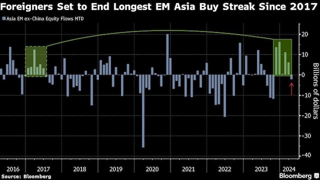 🚨 🚨 Foreign Investors Retreat From EM: Overseas investors have sold nearly $2.2 billion worth of equities in the region’s emerging markets in April, on a net basis, that excludes China. That will snap the longest streak of purchases going back to 2017