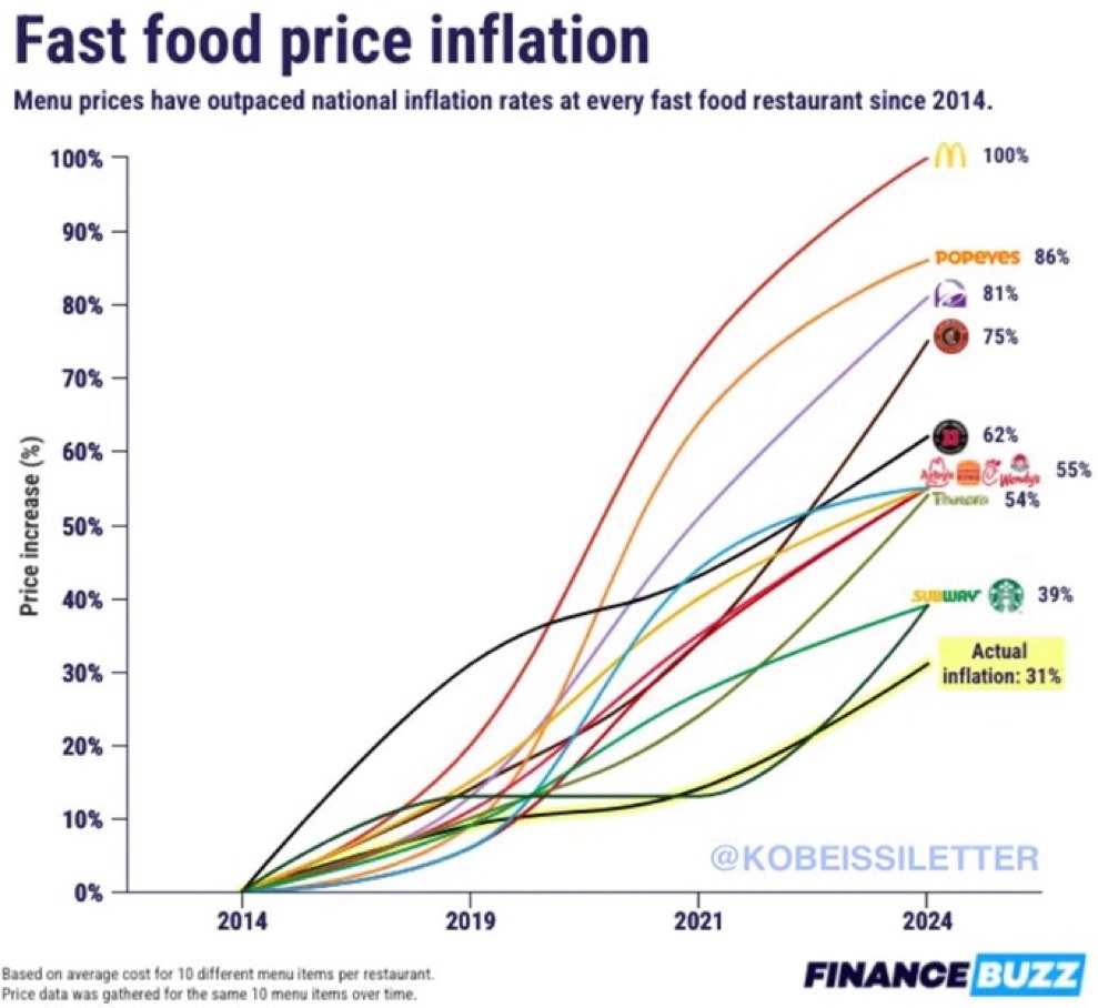 🍔 🌭 No Inflation? Prices at McDonalds have DOUBLED since 2014 while official inflation data shows just 31% inflation. Prices at Popeyes, Taco Bell, and Chipotle have risen by 86%, 81%, and 75%, respectively
