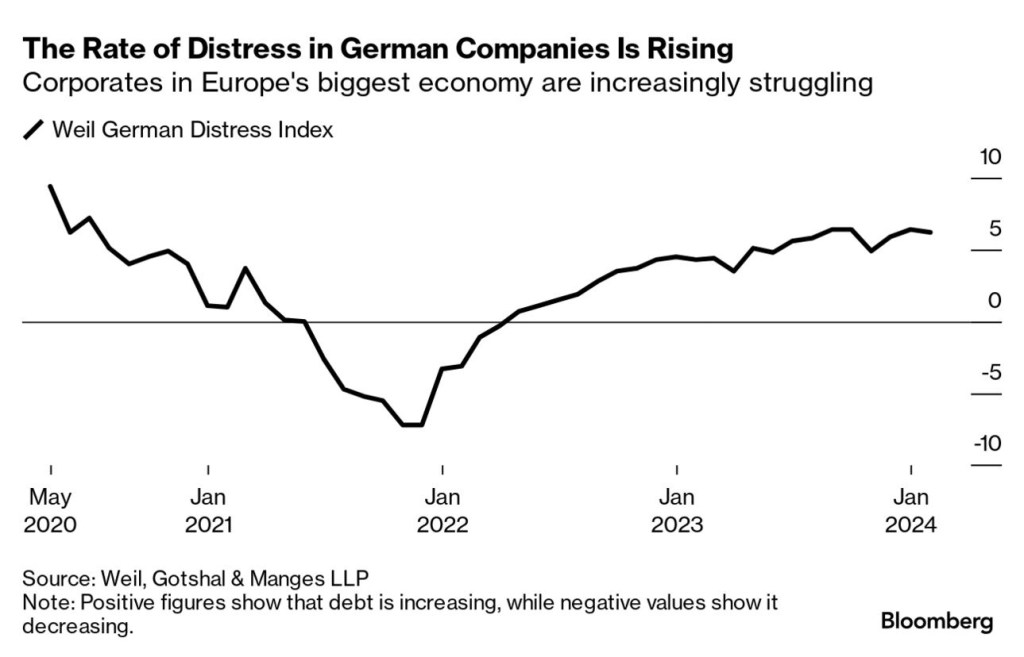 🇩🇪 🇩🇪 German corporate distress was the highest since 2020 at the start of this year, according to research published on Thursday. The study, by law firm Weil, Gotshal & Manges LLP, aggregates data from more than 3,750 listed European firms