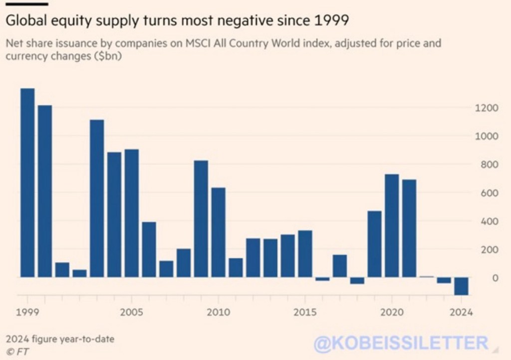 🚨 🚨 Global equity supply is now the most negative it has been since 1999. Year to date, global public equity supply has declined by $120 billion. Goldman Sachs expects stock buybacks to cross $1 trillion for the first time ever in 2025. Bullish sentiment is so strong that corporations want their stock back