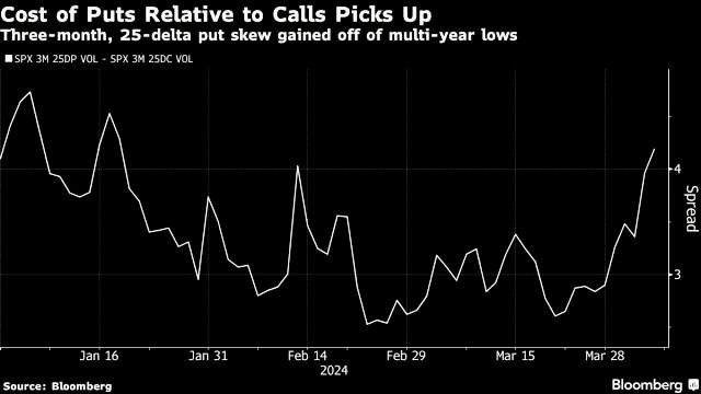🚨 🚨 Since late March, investors have been slowly tacking on hedges, pushing the cost of bearish three-month put options to the biggest premium over bullish contracts since mid-January