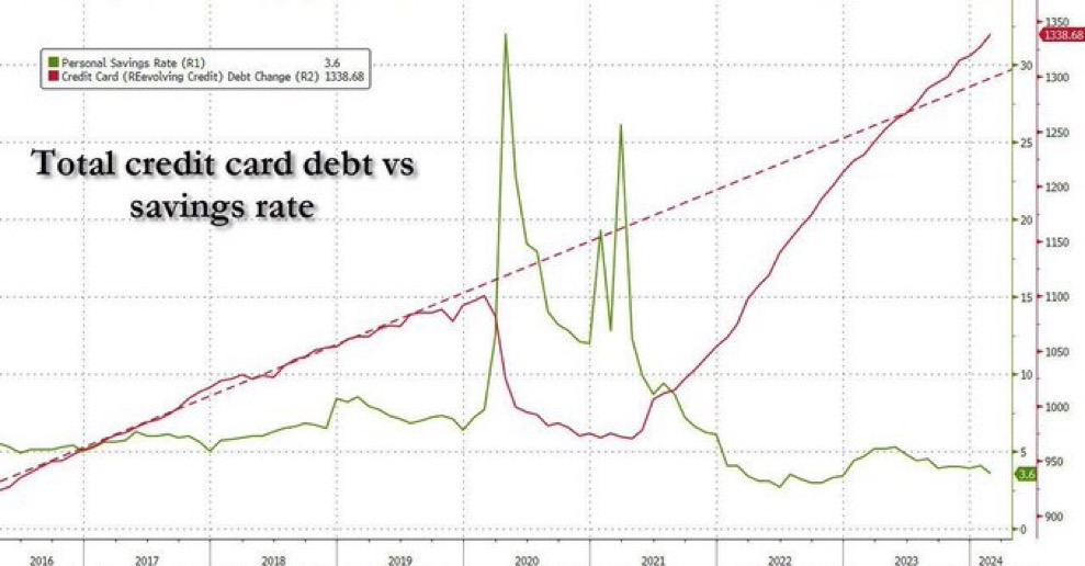 🚨 🚨 Total credit card debt is skyrocketing as savings rates have crashed. Total revolving credit in the US is now at $1.3 TRILLION, up from ~$960 billion in 2021