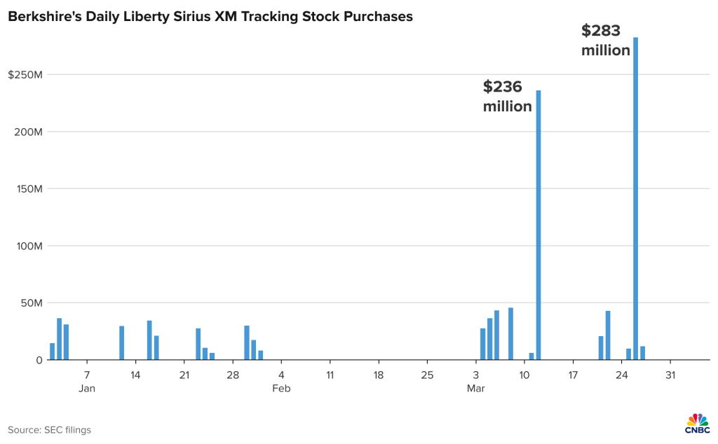 🚨 🚨 Berkshire Hathaway’s purchases of Liberty Media’s Sirius XM tracking stocks have topped one billion dollars since they began in early January, with the company revealing three more days of buying late last month