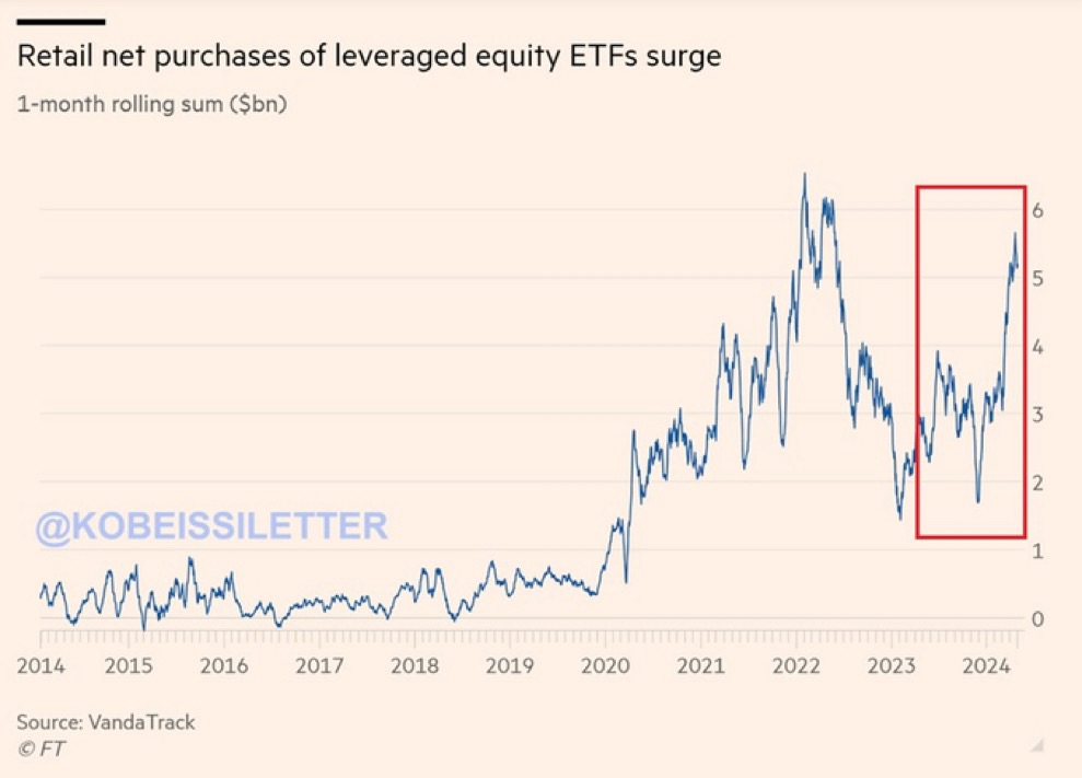 🚨 🚨 Retail investors have bought over $5 billion of leveraged equity ETFs in the last 12 months, the most since 2022. This marks a $3 billion increase on a 1-month rolling sum basis in just a few months. Since the October 2023 low, retail investors have been piling into leveraged ETFs