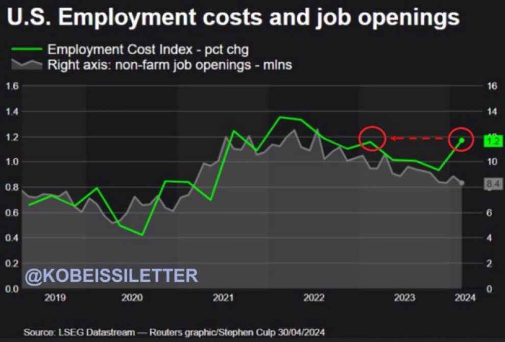 🚨 🚨 Further evidence that inflation is accelerating: US labor costs in the last quarter rose by the most since Q1 2023. The index surged by 1.2% in Q1 2024 after a 0.9% increase in Q4 2023, beating all expectations. Wage pressures are accelerating