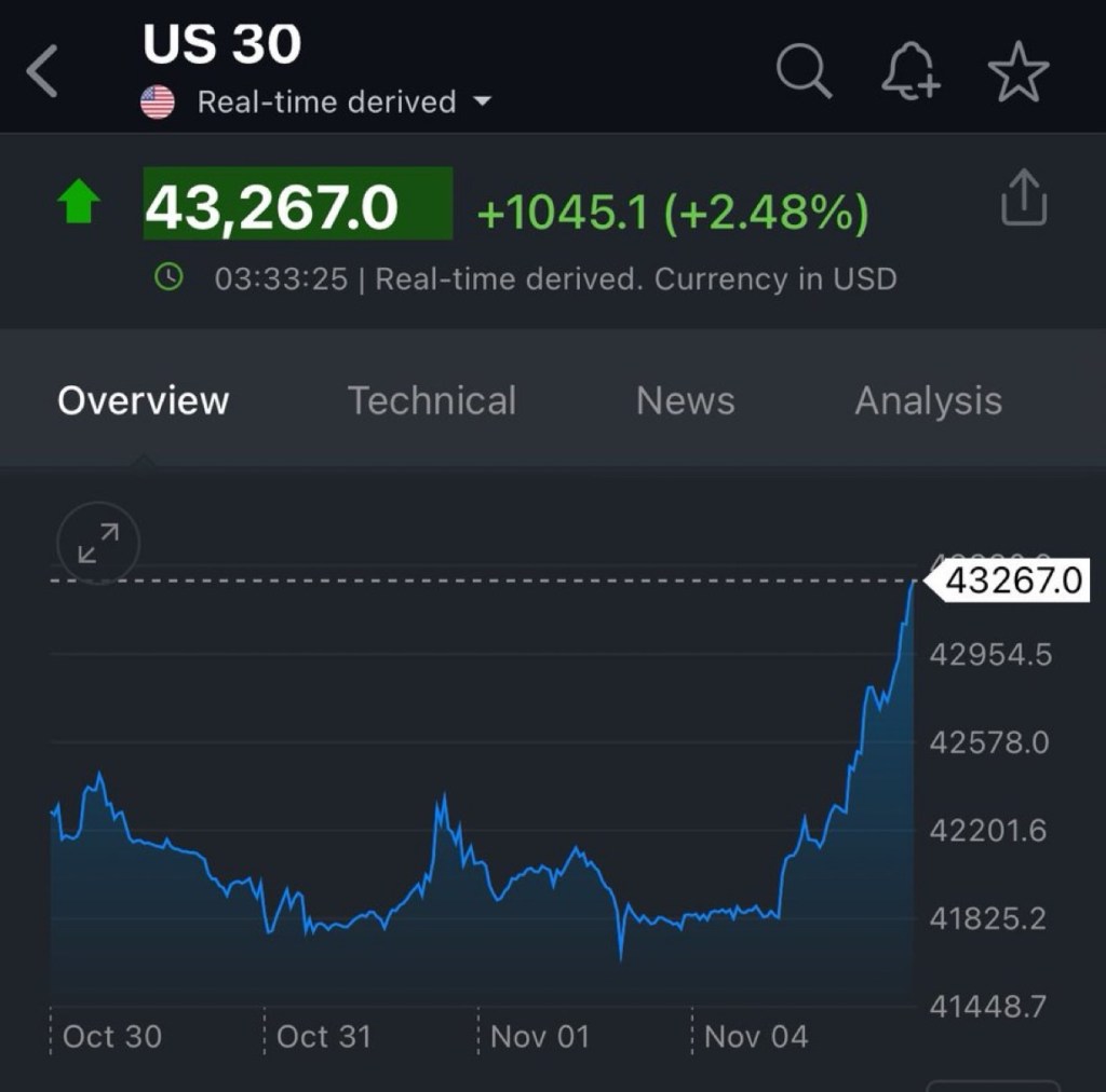 Dow Surges 1,000 Points Posted on November 6, 2024 by http://wealthcreation.club BREAKING: Dow Jones Industrial Average futures extend rally to over +1,000 points on the day. Share this: Share on X (Opens in new window) X Share on Facebook (Opens in new window) Facebook Like Loading... Published by http://wealthcreation.club http://wealthcreation.club—We are educating regular people about how to be able to make more money in a disciplined way View all posts by http://wealthcreation.club