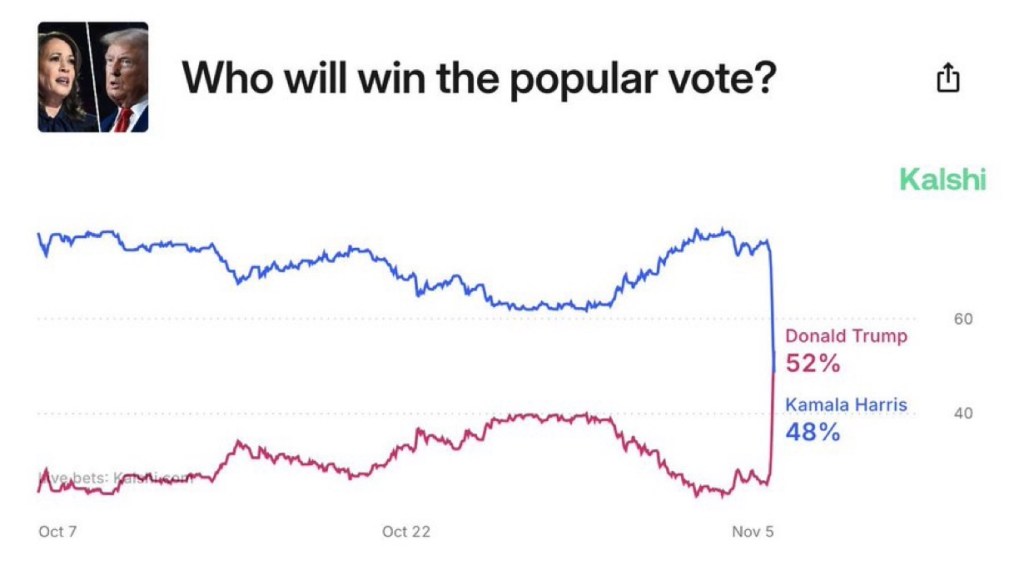 Trump Has Made History Posted on November 6, 2024 by http://wealthcreation.club BREAKING: For the first time ever, Donald Trump now leads in odds to win the popular vote.Donald Trump now has a 52% chance of winning the popular vote, according to @Kalshi. Share this: Share on X (Opens in new window) X Share on Facebook (Opens in new window) Facebook Like Loading... Published by http://wealthcreation.club http://wealthcreation.club—We are educating regular people about how to be able to make more money in a disciplined way View all posts by http://wealthcreation.club