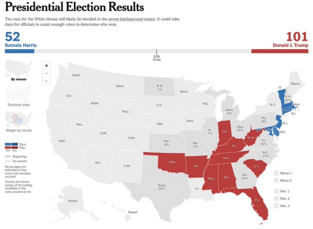 Trump Leads 101 To 52 Posted on November 6, 2024 by http://wealthcreation.club BREAKING: Kamala Harris has won Delaware and New Jersey while Donald Trump has won Arkansas, Oklahoma, and South Carolina.Donald Trump now leads 101 to 52. Share this: Share on X (Opens in new window) X Share on Facebook (Opens in new window) Facebook Like Loading... Published by http://wealthcreation.club http://wealthcreation.club—We are educating regular people about how to be able to make more money in a disciplined way View all posts by http://wealthcreation.club