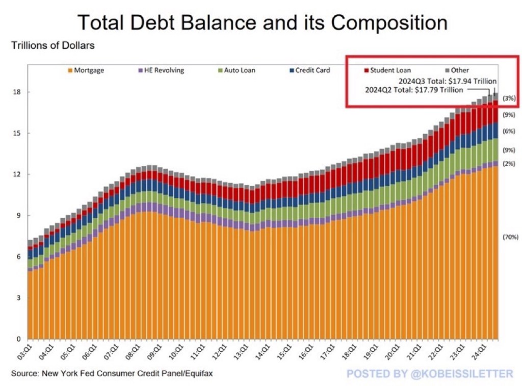 Household Debt Surges Posted on November 16, 2024 by http://wealthcreation.club 🇺🇸 🇺🇸 US household debt jumped by $147 billion in Q3 2024, to a new all-time high of $17.94 trillionRead More: bit.ly/Household-Debt Share this: Share on X (Opens in new window) X Share on Facebook (Opens in new window) Facebook Like Loading... Published by http://wealthcreation.club http://wealthcreation.club—We are educating regular people about how to be able to make more money in a disciplined way View all posts by http://wealthcreation.club