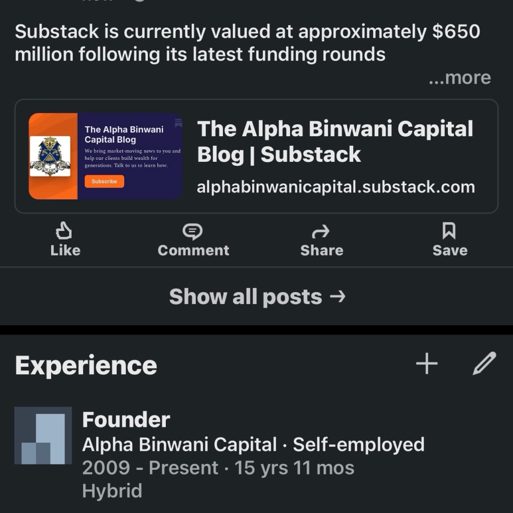We Are Now On Substack Posted on November 17, 2024 by http://wealthcreation.club Substack is currently valued at approximately $650 million following its latest funding roundsWe Are Now On SubstackSubscribe For Free: bit.ly/Alpha-Binwani-Substack Share this: Share on X (Opens in new window) X Share on Facebook (Opens in new window) Facebook Like Loading... Published by http://wealthcreation.club http://wealthcreation.club—We are educating regular people about how to be able to make more money in a disciplined way View all posts by http://wealthcreation.club