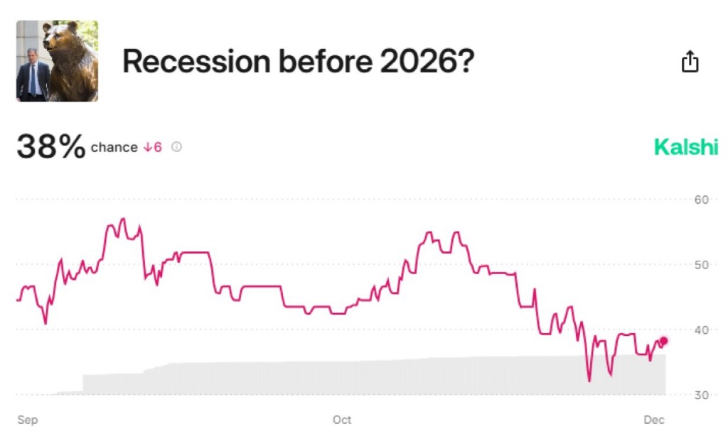No Recession In 2025 Posted on December 3, 2024 by http://wealthcreation.club 🚨 🚨 The odds of the US entering a recession before 2026 are down to 38%.Read More: bit.ly/No-Recession-2025 Share this: Share on X (Opens in new window) X Share on Facebook (Opens in new window) Facebook Like Loading... Published by http://wealthcreation.club http://wealthcreation.club—We are educating regular people about how to be able to make more money in a disciplined way View all posts by http://wealthcreation.club