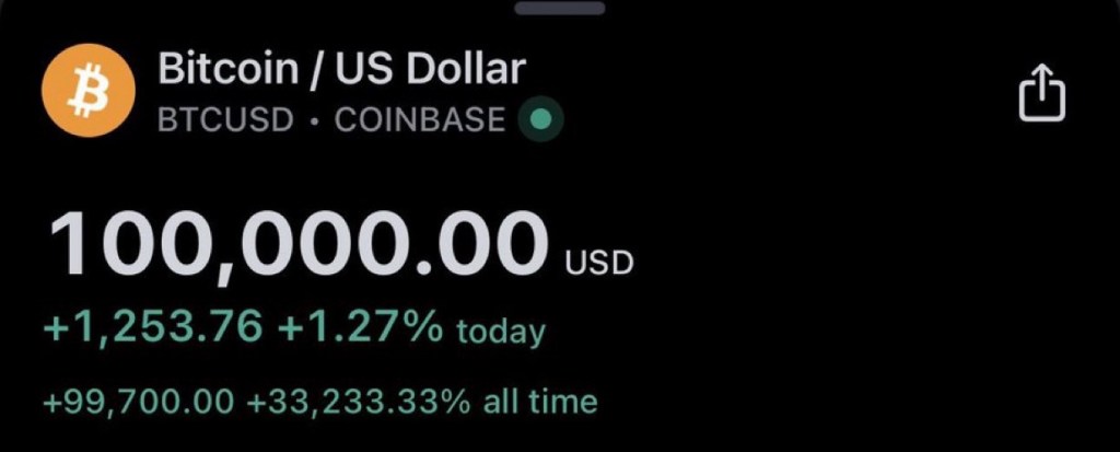 Bitcoin Trades At $100K Posted on December 5, 2024 by http://wealthcreation.club 🚨 🚨 BREAKING: #Bitcoin officially hits $100,000 for the first time in historyRead More: bit.ly/Bitcoin-100K Share this: Share on X (Opens in new window) X Share on Facebook (Opens in new window) Facebook Like Loading... Published by http://wealthcreation.club http://wealthcreation.club—We are educating regular people about how to be able to make more money in a disciplined way View all posts by http://wealthcreation.club