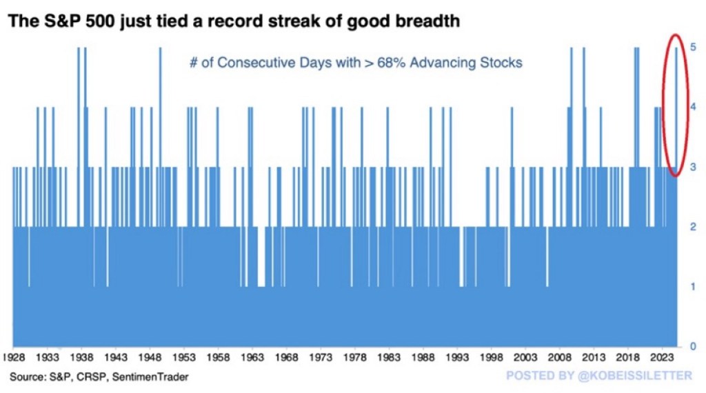 History has been made again in stocks: Over 68% of the S&P 500 stocks have closed higher for 5 consecutive days, matching all previous records since 1928. If the same occurrence happens on Tuesday, it will mark a new record streak. In other words, the market’s breadth has significantly improved. The last 2 times when such a streak occurred were in January and June 2019 which resulted in more upside in stocks. A similar trend was seen in September 2009 which resulted in the S&P 500 rallying 8% in the subsequent 3 months