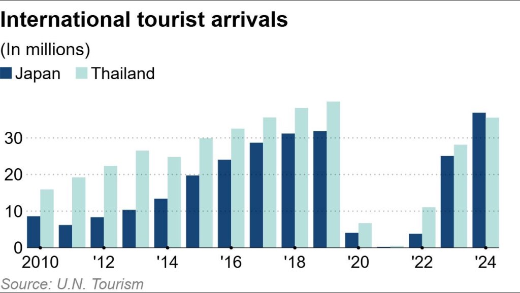 Flight bookings from China to Japan have more than doubled in the first quarter from a year earlier, thanks also to the weaker yen and airfares as low as $150 from Shanghai to Tokyo. That helped Japan overtake Thailand as the top overseas destination for Chinese holidaymakers during the eight-day holiday this year. Visa-free entries to Singapore and Malaysia have also drawn Chinese tourists away from Thailand