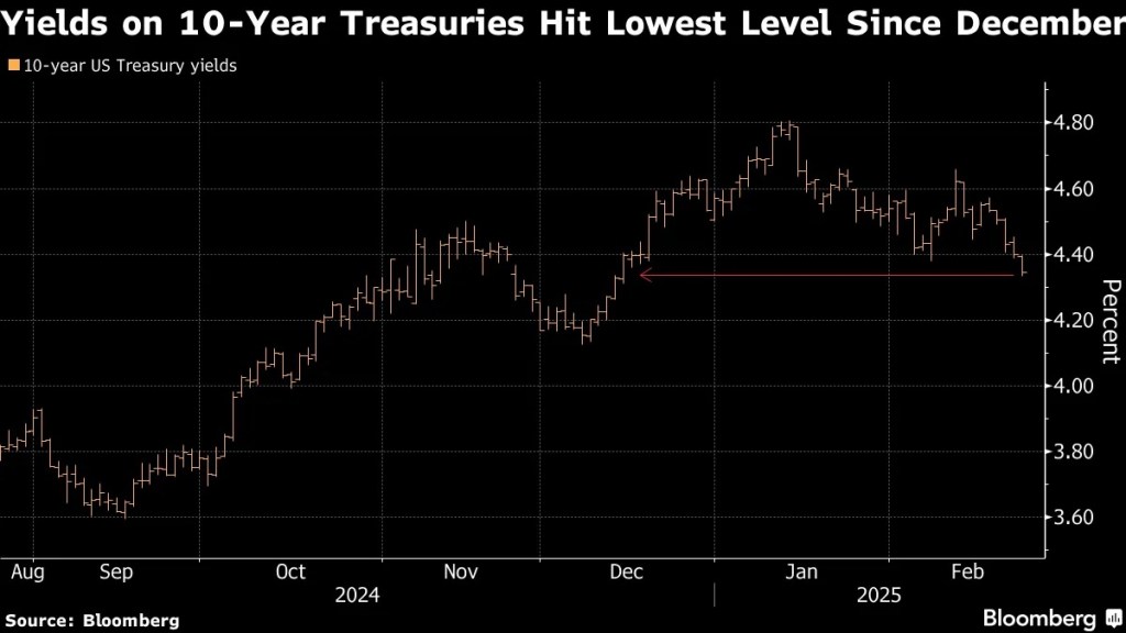 Bonds Are Climbing: Yields on 10-year US bonds fell as much as seven basis points to 4.33%, the lowest level in over two months. Money markets implied more easing from the Fed, fully pricing two quarter-point reductions this year for the first time in four weeks. Markets are growing more confident that the US economy is weakening and interest-rate reductions will resume, as uncertainty around the Trump administration’s policies weighs on business expectations. An auction of two-year notes drew strong demand on Monday