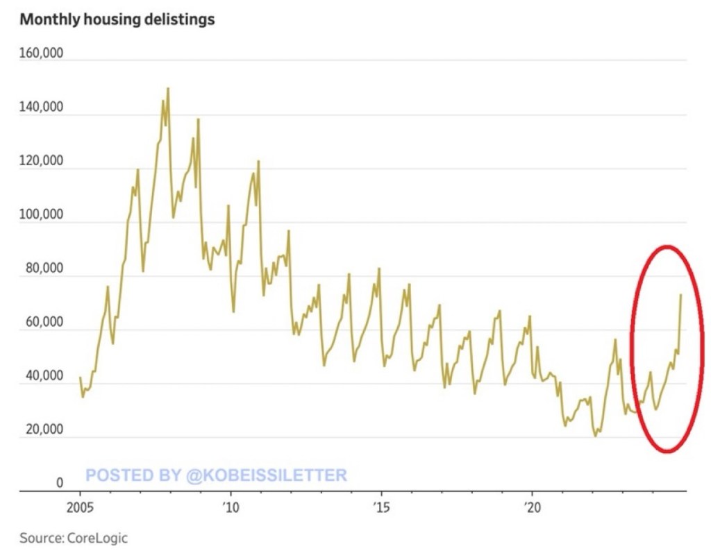 The US housing market is showing some cracks: ~73,000 homes were delisted in December after they failed to attract a buyer, the highest in 9 years. This was a 64% increase from the ~44,500 homes pulled off the market in December 2023