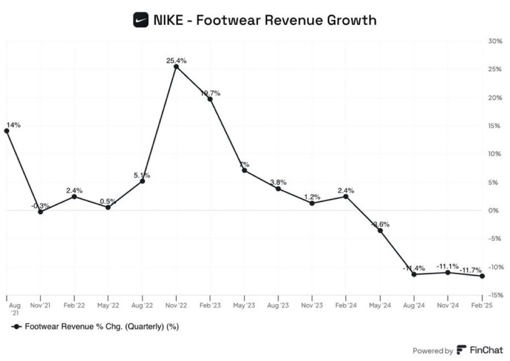 Nike’s recent financial results reveal a significant downturn, with footwear revenue declining approximately 12% year-over-year in the latest quarter and total revenue falling 9% to $11.27 billion. This decline affected all Nike Brand and Converse geographies, marking a notable setback for the company. The poor performance is particularly striking given Nike’s consistent revenue growth over the past decade, with North American footwear revenue alone reaching $12.23 billion in 2022. This sharp contrast to historical trends indicates substantial challenges in Nike’s core business segments and underscores the severity of the company’s current financial situation