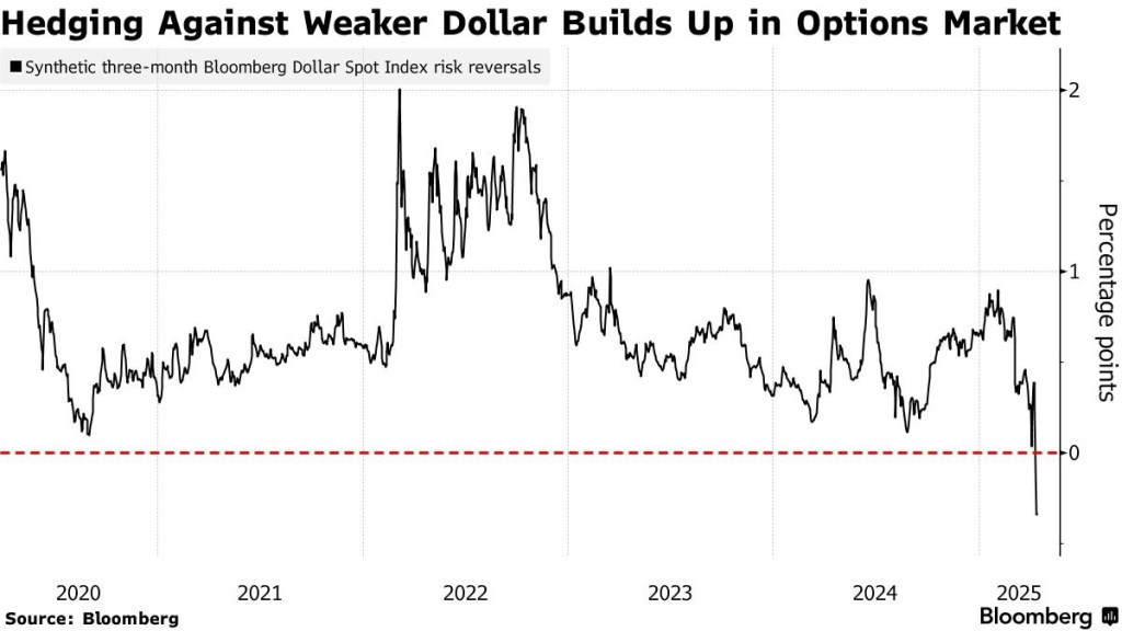 Demand for hedging against potential dollar declines has surged to a five-year high due to concerns over President Trump’s aggressive tariff policies, which threaten U.S. economic exceptionalism and the greenback’s stability. A key index measuring risk reversals on the dollar has dropped to its lowest level since March 2020, reflecting heightened uncertainty