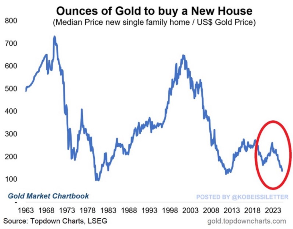 As of April 2025, it takes just 121 ounces of gold (about 3.4 kg) to purchase the median-priced new single-family home in the United States-a 12-year low and a sharp drop from the roughly 280 ounces needed in late 2022 and the 650 ounces required in 2001, reflecting gold’s significant outperformance relative to real estate over the past two decades. This shift comes as gold prices have surged more than 66% in two years to over $3,300 per ounce, while the median sale price of a new home in March stood at $403,600, underscoring gold’s effectiveness in preserving-and even increasing-investors’ purchasing power amid economic uncertainty and inflation